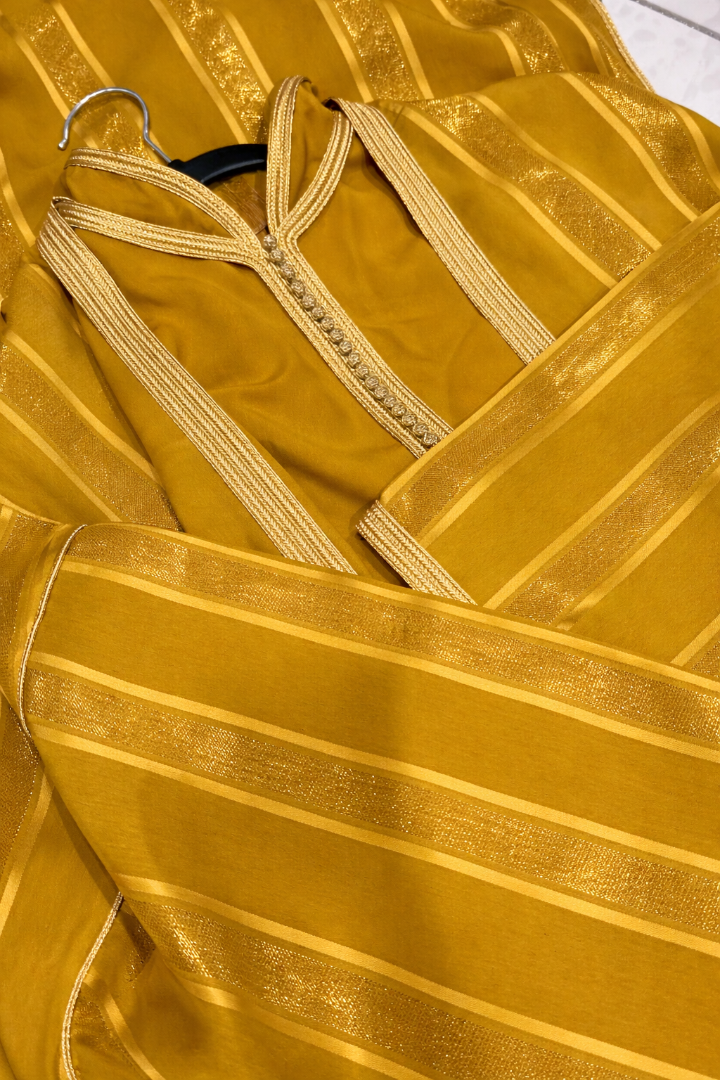 Laissez-vous séduire par l’intensité lumineuse de cette abaya deux pièces dans une somptueuse teinte moutarde, sublimée par des finitions dorées éclatantes. Une création pensée pour la femme qui aime affirmer son style avec caractère, élégance et raffinement.