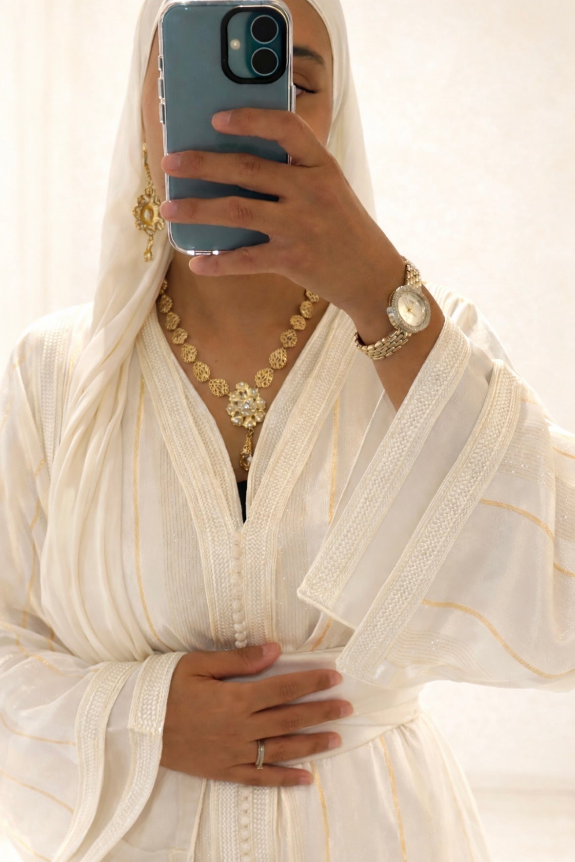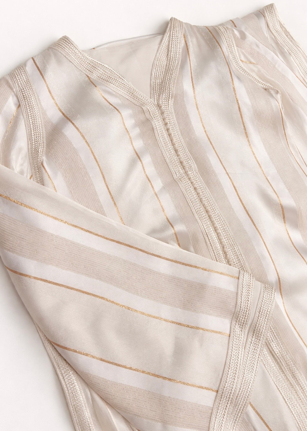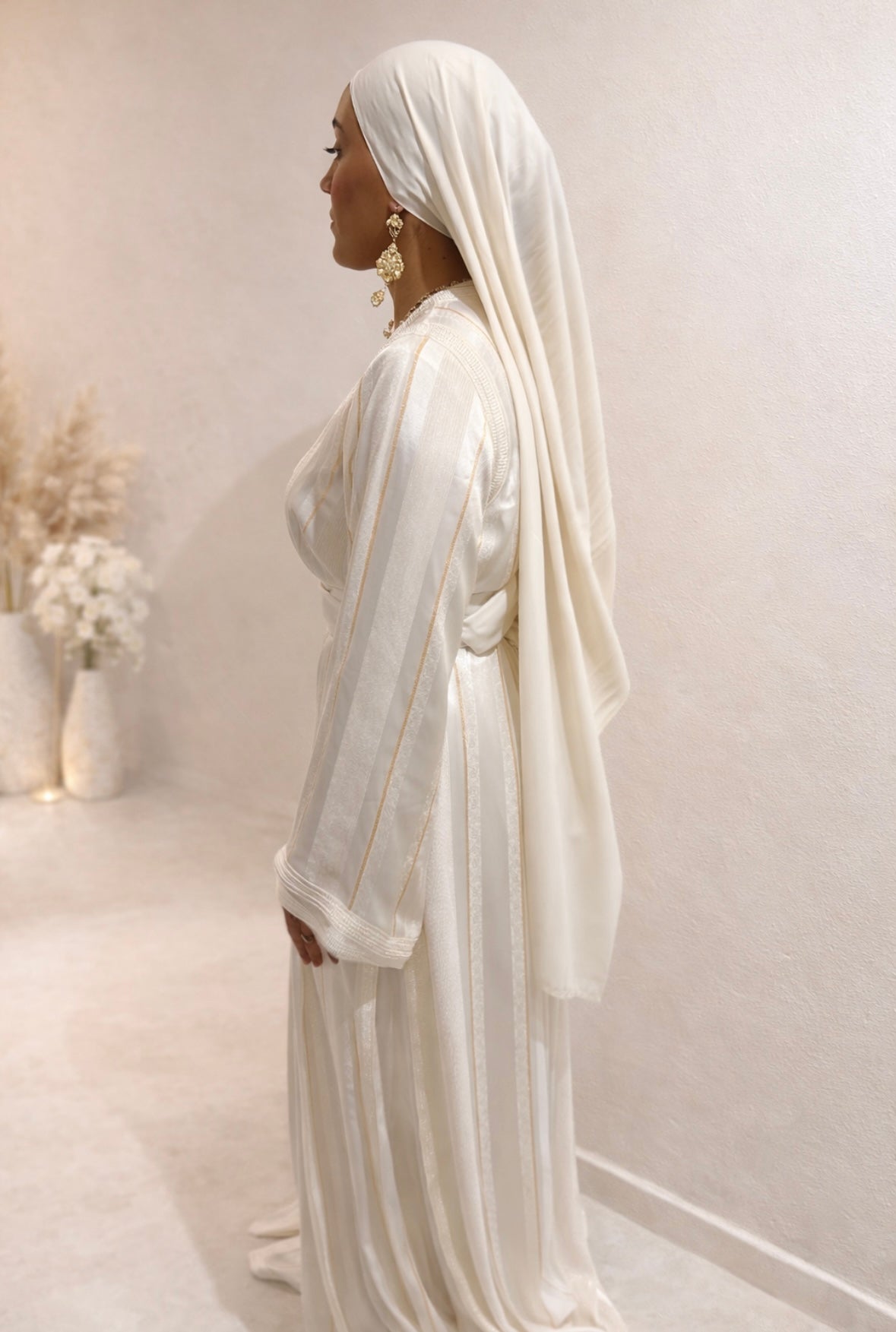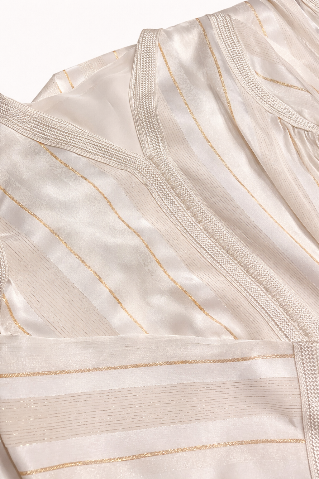 La Takchita Jawhara incarne le raffinement et la grâce de la tradition marocaine sublimée par une touche contemporaine. Confectionnée dans un tissu satiné délicatement fluide, elle se distingue par ses fines rayures dorées et ses détails travaillés avec précision le long du buste et de la longueur, apportant éclat et sophistication à chaque mouvement.